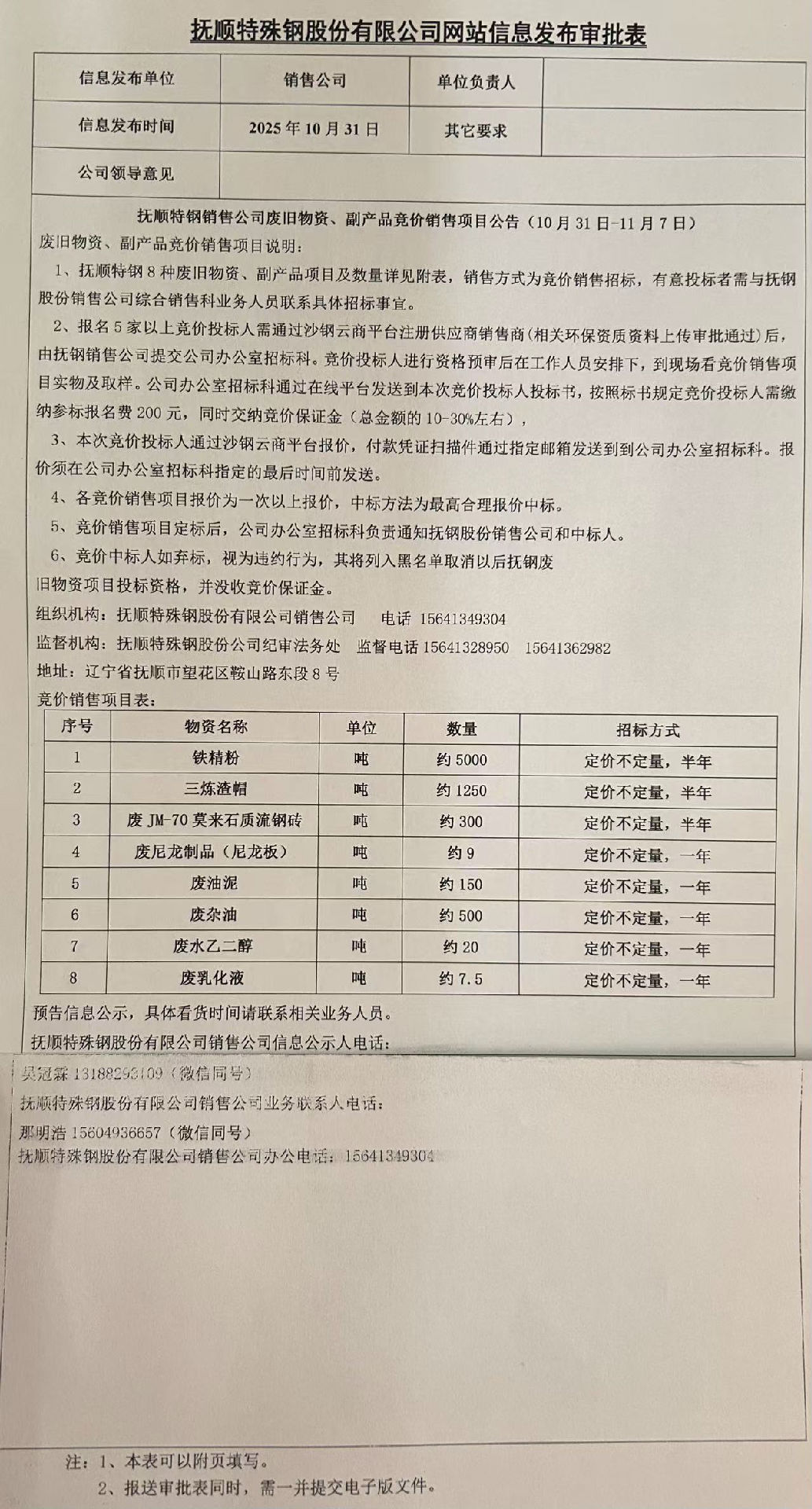 撫順特鋼銷售公司廢舊物資、副產品競價銷售項目公告(10月31日-11月7日