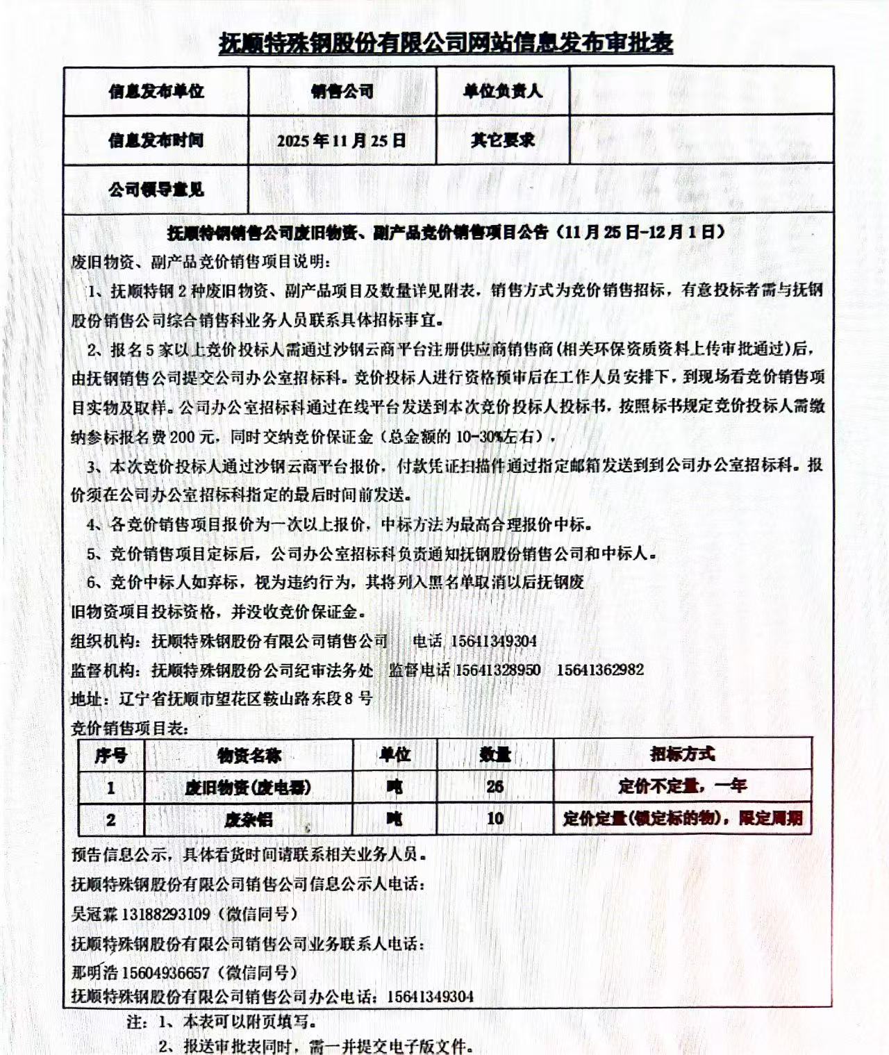 撫順特鋼銷售公司廢舊物資、副產品競價銷售項目公告(11月25日-12月1日)