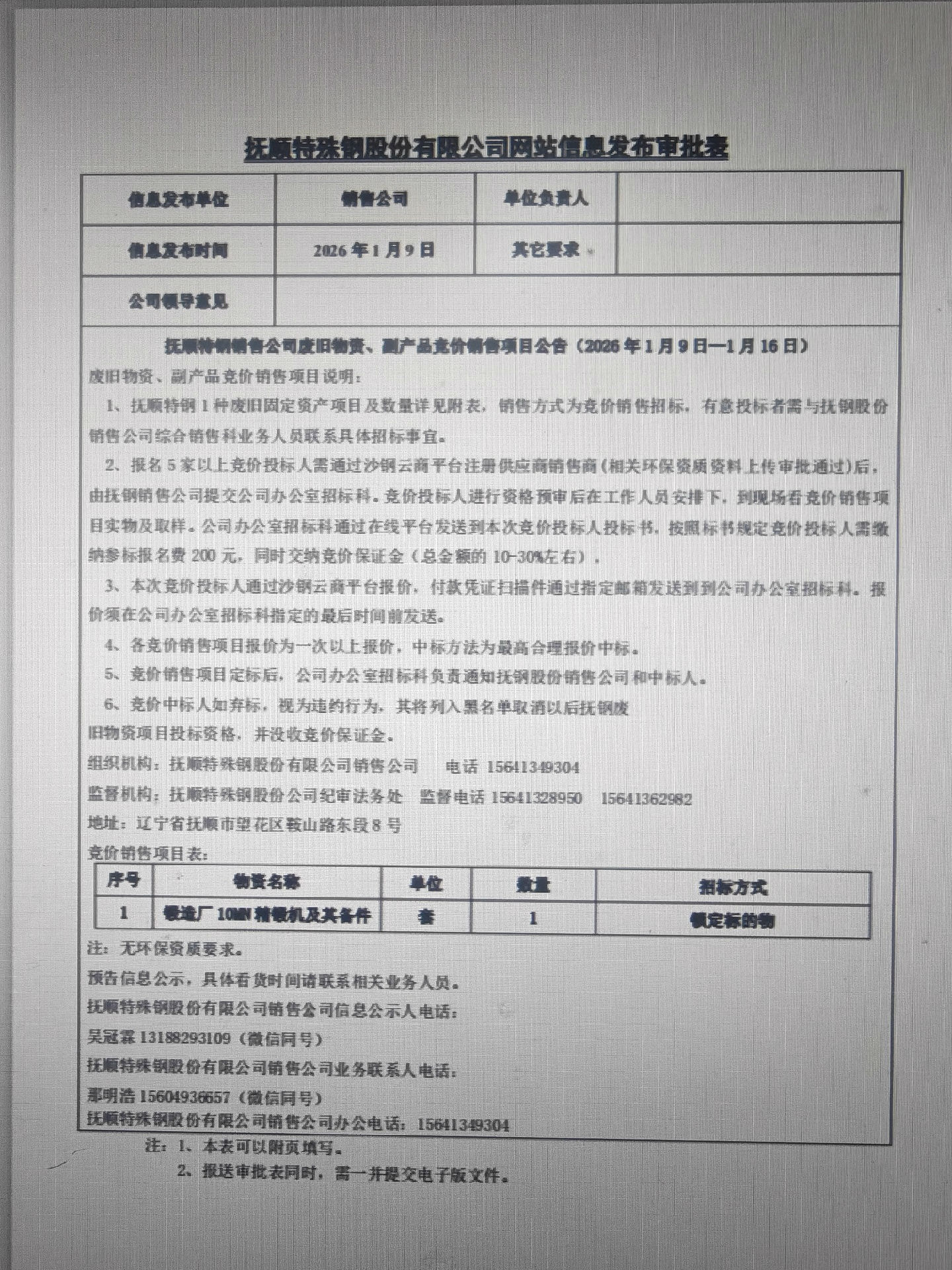 撫順特鋼銷售公司廢舊物資、副產(chǎn)品競(jìng)價(jià)銷售項(xiàng)目公告(1月9日-1月16日)
