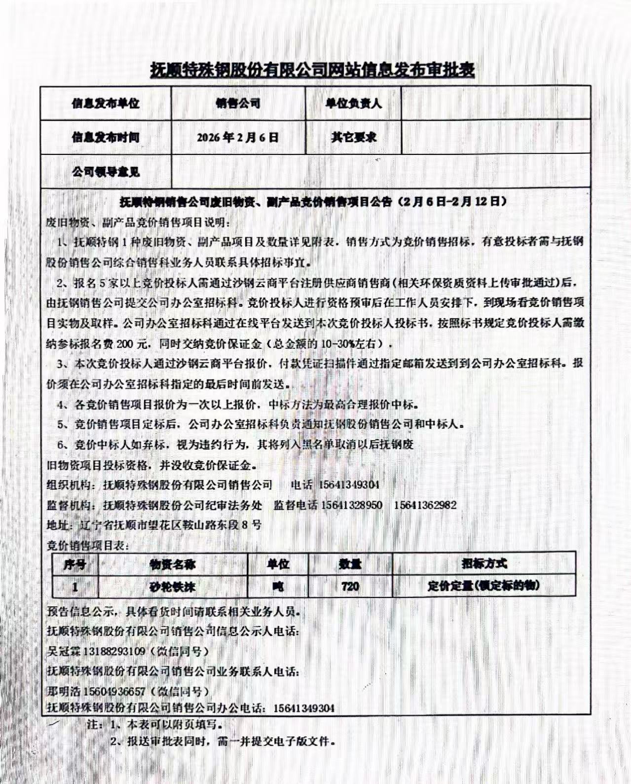 撫順特鋼銷(xiāo)售公司廢舊物資、副產(chǎn)品競(jìng)價(jià)銷(xiāo)售項(xiàng)目公告(2月6日-2月12日)
